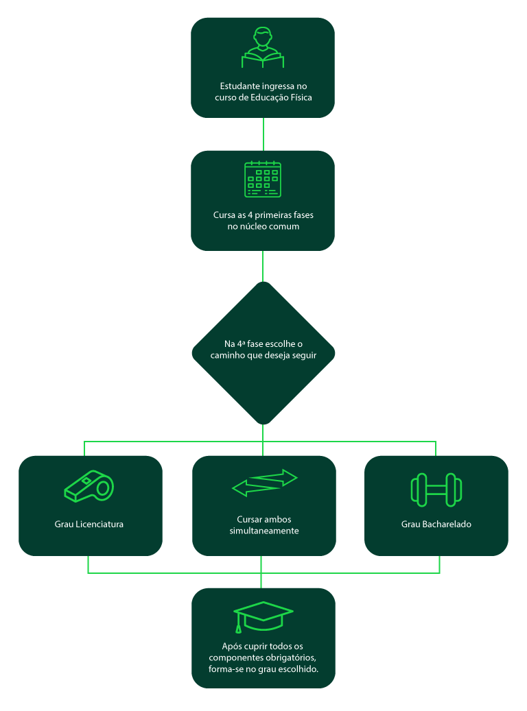Formação em Bacharelado – Habilita para atuar com atividades físicas em suas diversas manifestações: ginásticas, exercícios físicos, desportos, jogos, lutas, danças, atividades rítmicas, expressivas e acrobáticas, reabilitação e ergonomia, relaxamento corporal, yoga, exercícios compensatórios à atividade laboral, entre outras práticas corporais, com o propósito de prestar serviços que favoreçam o desenvolvimento da saúde, contribuindo para a capacitação e/ou restabelecimento de níveis adequados de desempenho e condicionamento físico-corporal, em hospitais, saúde pública, na gestão esportiva, entre outros locais, exceto a escola.